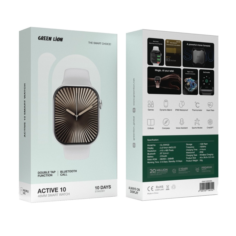 Display: 2.07-inch AMOLED, 410 × 480 pixels Battery: 375mAh, 2-3 days active use, 10 days standby Bluetooth: BT 3.0 + 5.1, Bluetooth calling Health Features: Heart rate monitor, thermometer Sports Modes: Multiple modes for fitness tracking Waterproof: IP68 rating Charging: Wireless charging, 4-hour recharge time Additional Features: Dynamic Island, ChatGPT, games, e-book reader
